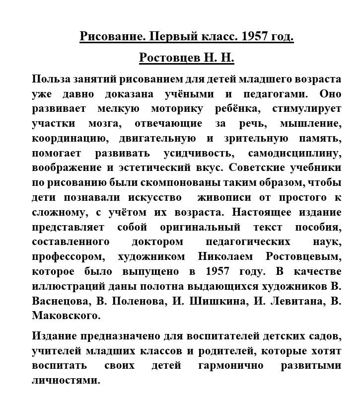 Польза занятий рисованием для детей младшего возраста уже давно доказана учёными и педагогами. Оно развивает мелкую моторику ребёнка, стимулирует участки мозга, отвечающие за речь, мышление, координацию, двигательную и зрительную память, помогает развивать усидчивость, самодисциплину, воображение и эстетический вкус. Советские учебники по рисованию были скомпонованы таким образом, чтобы дети познавали искусство живописи от простого к сложному, с учётом их возраста. Настоящее издание представляет собой оригинальный текст пособия, составленного доктором педагогических наук, профессором, художником Николаем Ростовцевым, которое было выпущено в 1957 году. В качестве иллюстраций даны полотна выдающихся художников В. Васнецова, В. Поленова, И. Шишкина, И. Левитана, В. Маковского.