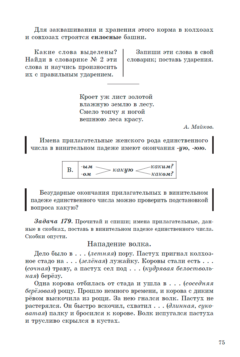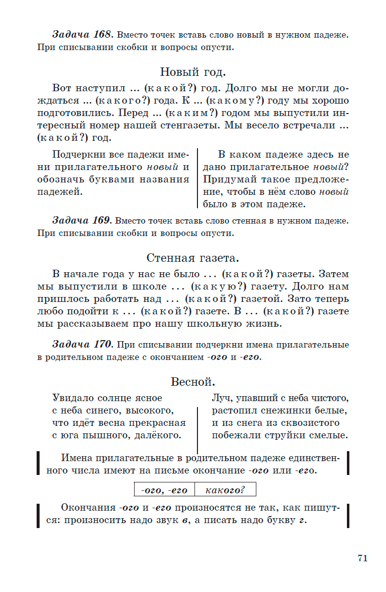 Учебник содержит подробную информацию по грамматике, правописанию, развитию речи и снабжён интересными, закрепляющими задачами и упражнениями. В качестве примеров приведены отрывки из произведений А. Пушкина, И. Тургенева, М. Горького, В. Жуковского, В. Маяковского, Н. Некрасова, Л. Толстого, К. Ушинского, В. Короленко, М. Исаковского, А. Гайдара.