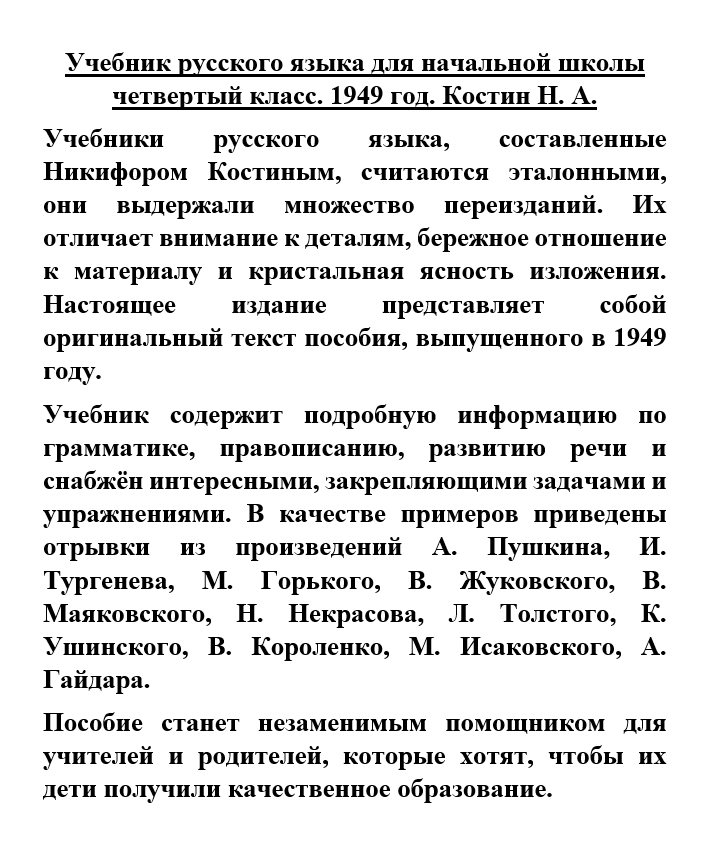 Учебники русского языка, составленные Никифором Костиным, считаются эталонными, они выдержали множество переизданий. Их отличает внимание к деталям, бережное отношение к материалу и кристальная ясность изложения. Настоящее издание представляет собой оригинальный текст пособия, выпущенного в 1949 году.