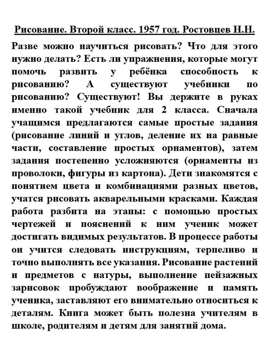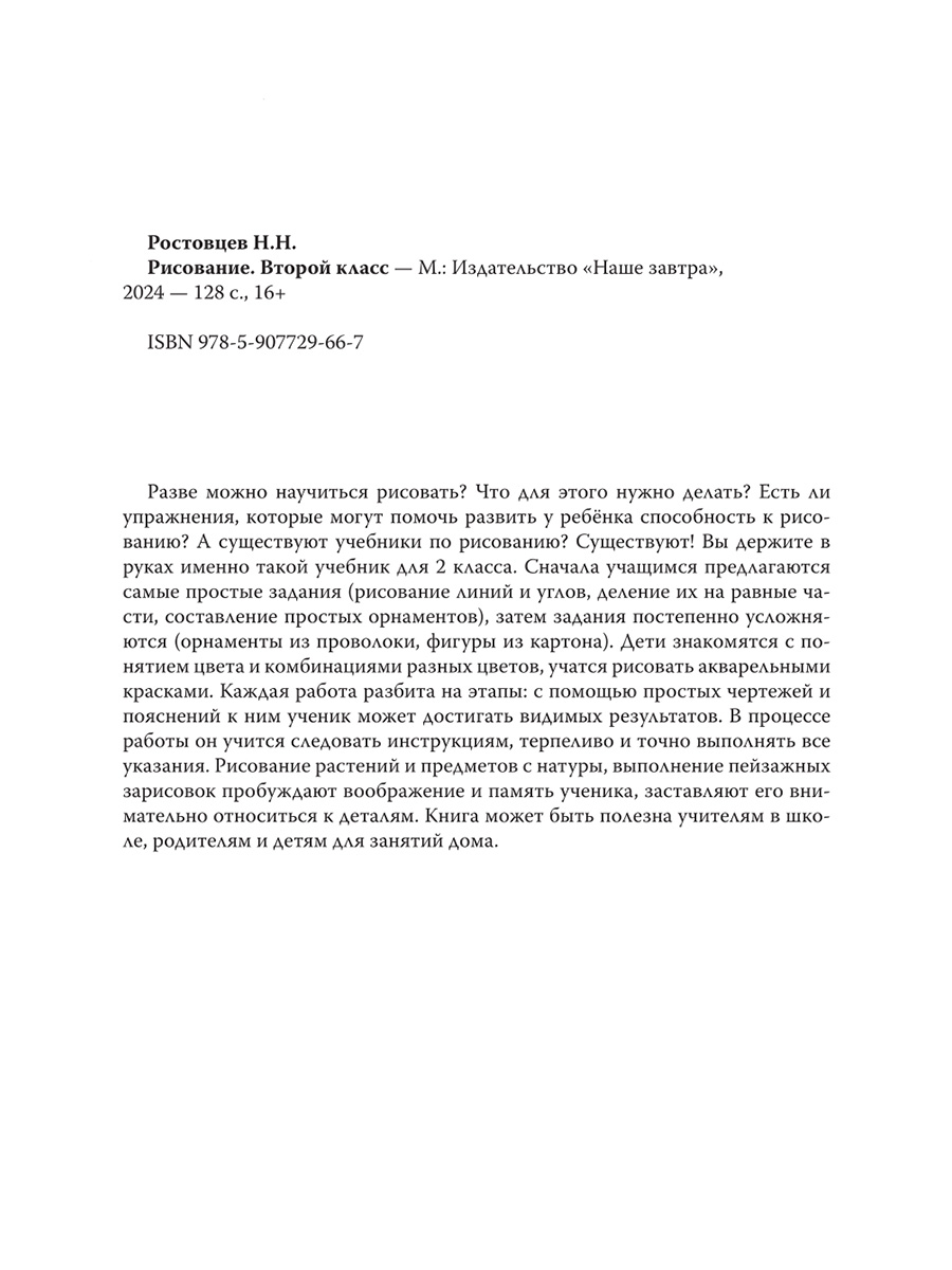 Разве можно научиться рисовать? Что для этого нужно делать? Есть ли упражнения, которые могут помочь развить у ребёнка способность к рисованию? А существуют учебники по рисованию? Существуют! Вы держите в руках именно такой учебник для 2 класса. Сначала учащимся предлагаются самые простые задания (рисование линий и углов, деление их на равные части, составление простых орнаментов), затем задания постепенно усложняются (орнаменты из проволоки, фигуры из картона). Дети знакомятся с понятием цвета и комбинациями разных цветов, учатся рисовать акварельными красками. Каждая работа разбита на этапы: с помощью простых чертежей и пояснений к ним ученик может достигать видимых результатов. В процессе работы он учится следовать инструкциям, терпеливо и точно выполнять все указания. Рисование растений и предметов с натуры, выполнение пейзажных зарисовок пробуждают воображение и память ученика, заставляют его внимательно относиться к деталям. Книга может быть полезна учителям в школе, родителям и детям для занятий дома.