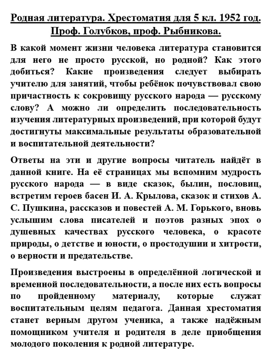 Родная литература. Хрестоматия для 5 кл. 1952 год. Проф. Голубков, проф. Рыбникова и др.