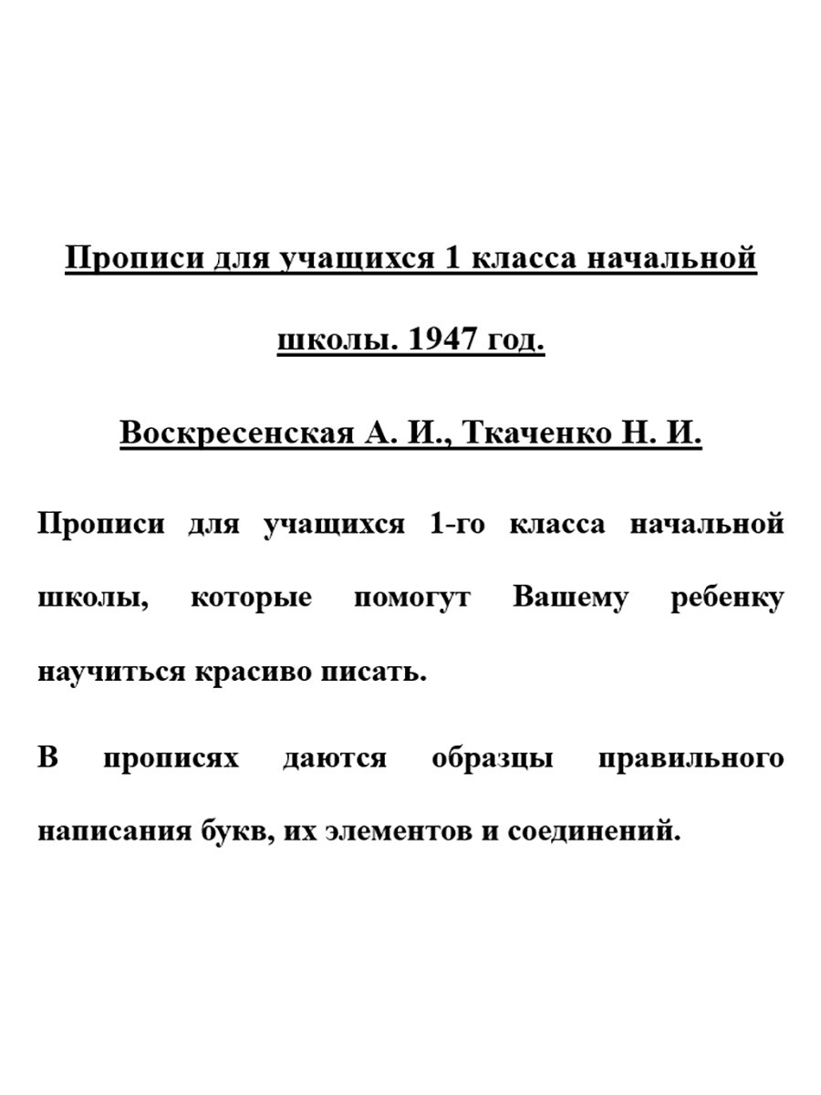 Прописи для учащихся 1 класса начальной школы. 1947 год. Воскресенская А.И., Ткаченко Н.И.