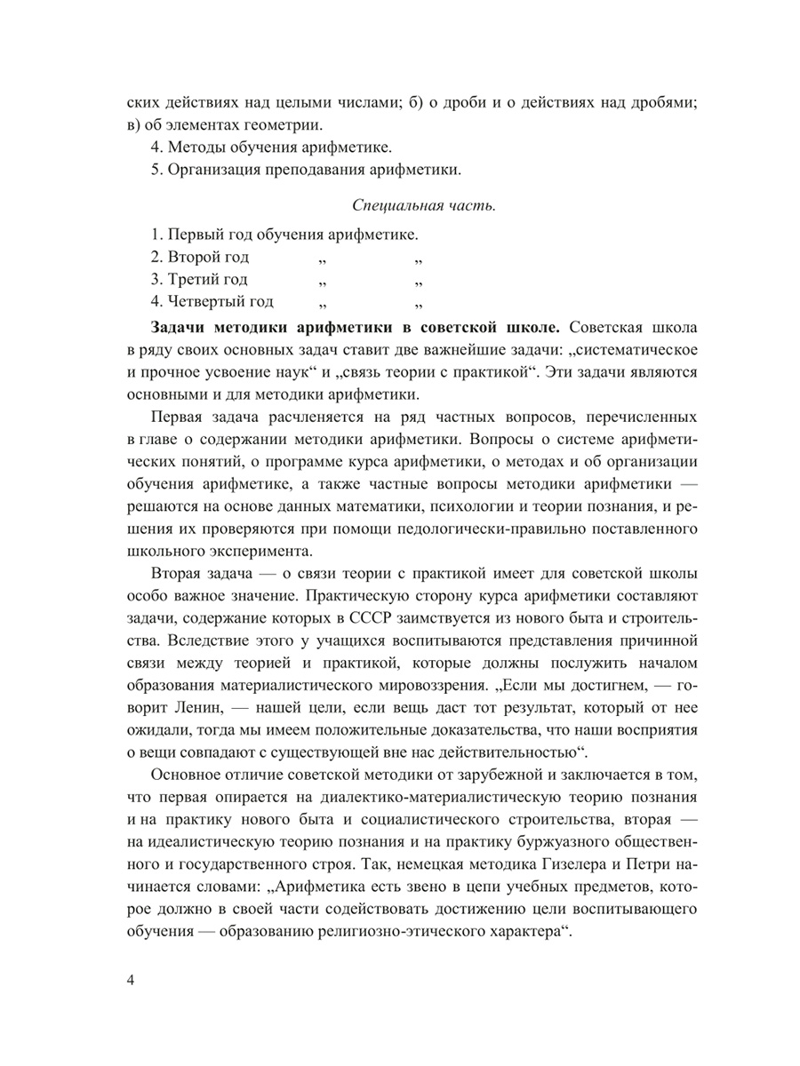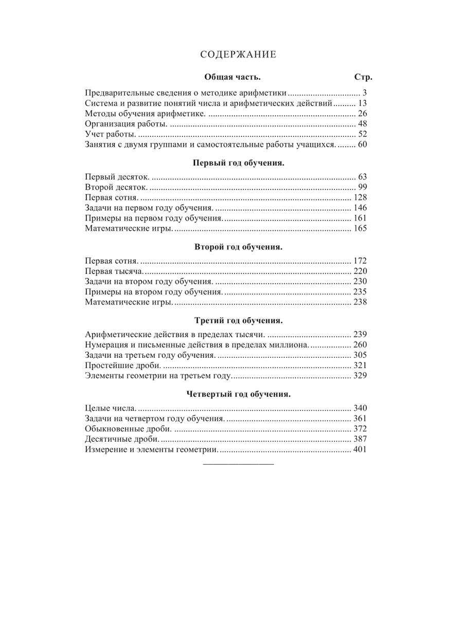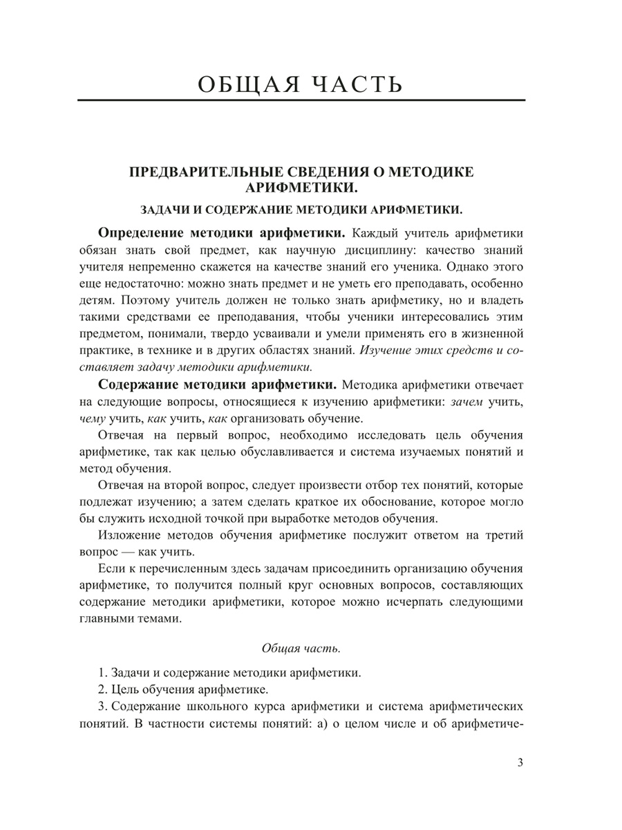 Преподавание арифметики требует от учителя отличного знания предмета, а также понимания того, зачем учить, чему учить, как учить, как организовать обучение. Данное учебное пособие помогает преподавателю обеспечить систематическое и прочное усвоение учащимися науки и связь теории с практикой — главные задачи любой методики обучения. За общей частью (о задачах, цели, методах обучения и организации преподавания арифметики) следует специальная часть — методика преподавания по годам обучения. Помимо теоретической информации, каждый раздел содержит большое количество примеров, рисунков, чертежей, развернутых пояснений, математических игр.