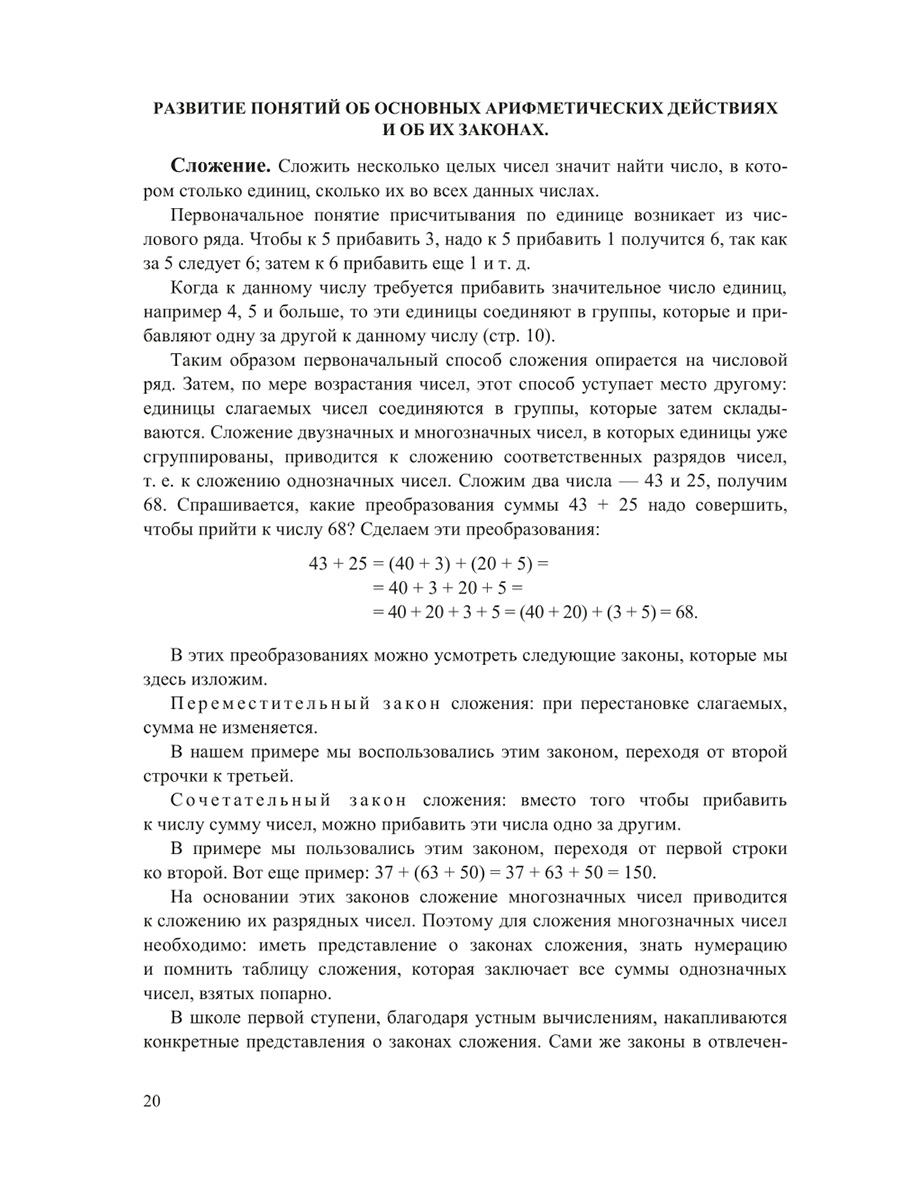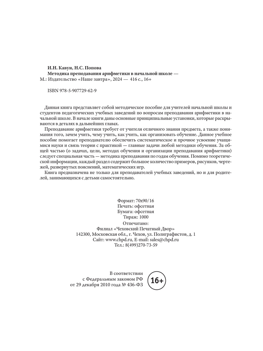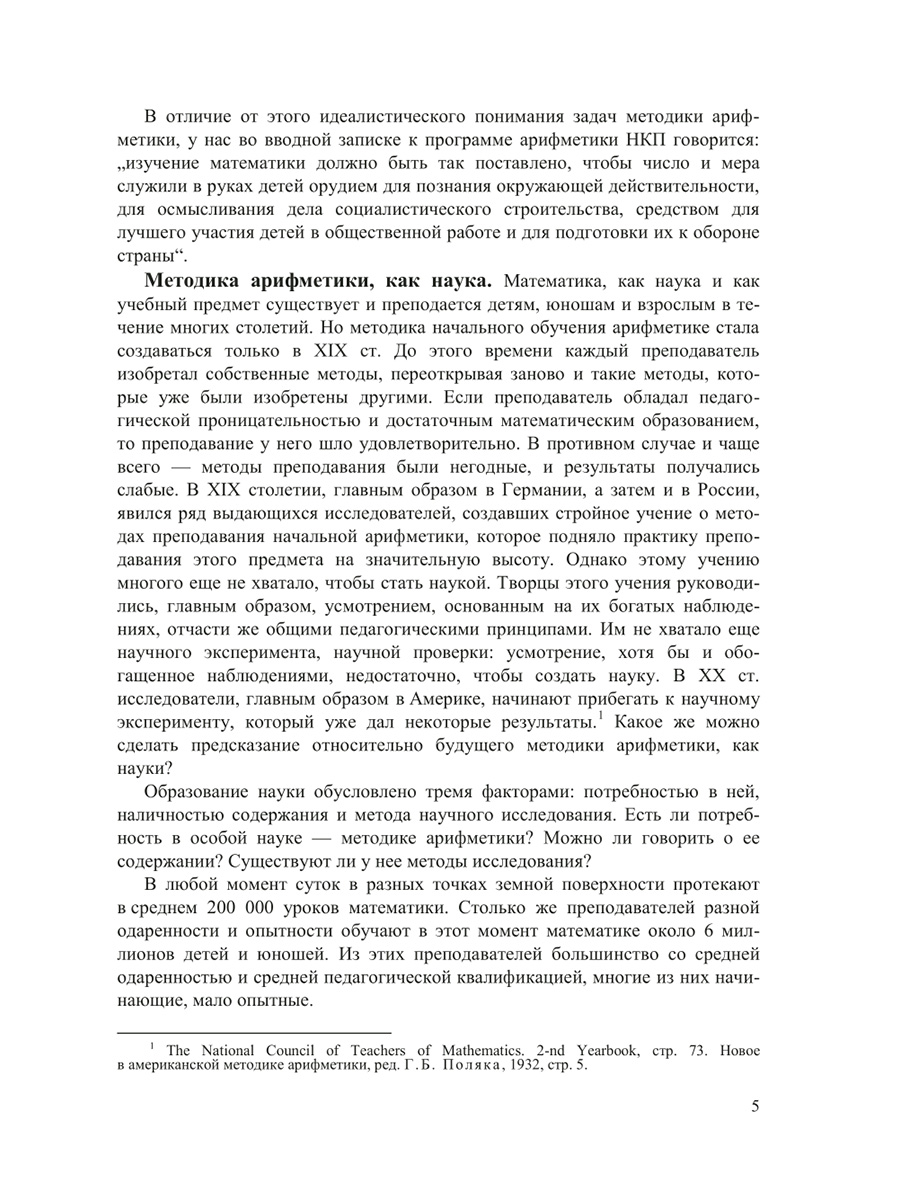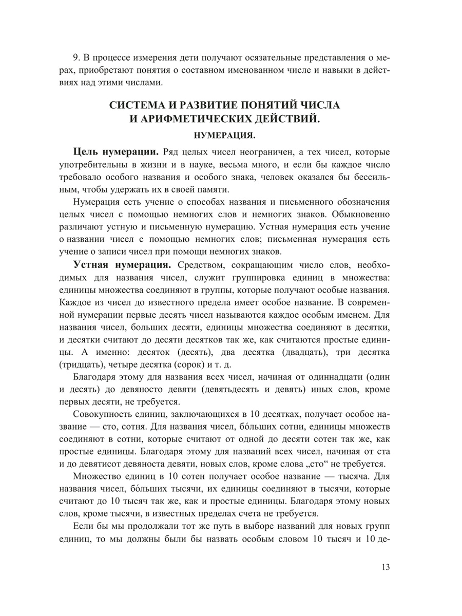 Преподавание арифметики требует от учителя отличного знания предмета, а также понимания того, зачем учить, чему учить, как учить, как организовать обучение. Данное учебное пособие помогает преподавателю обеспечить систематическое и прочное усвоение учащимися науки и связь теории с практикой — главные задачи любой методики обучения. За общей частью (о задачах, цели, методах обучения и организации преподавания арифметики) следует специальная часть — методика преподавания по годам обучения. Помимо теоретической информации, каждый раздел содержит большое количество примеров, рисунков, чертежей, развернутых пояснений, математических игр.