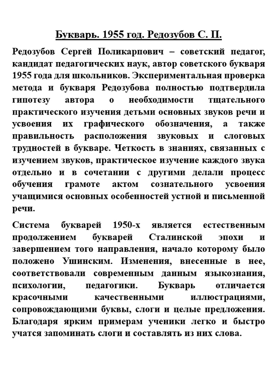 Редозубов Сергей Поликарпович – советский педагог, кандидат педагогических наук, автор советского букваря 1955 года для школьников. Экспериментальная проверка метода и букваря Редозубова полностью подтвердила гипотезу автора о необходимости тщательного практического изучения детьми основных звуков речи и усвоения их графического обозначения, а также правильность расположения звуковых и слоговых трудностей в букваре. Четкость в знаниях, связанных с изучением звуков, практическое изучение каждого звука отдельно и в сочетании с другими делали процесс обучения грамоте актом сознательного усвоения учащимися основных особенностей устной и письменной речи.