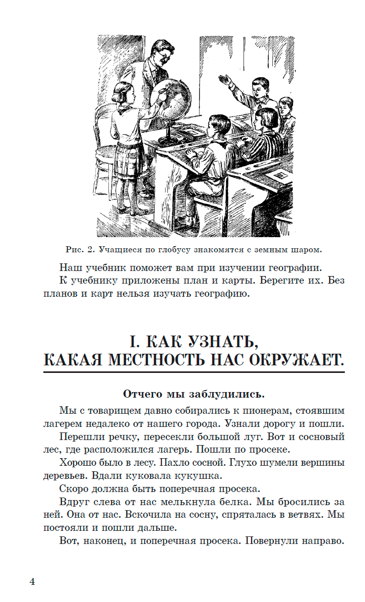 География изучает устройство окружающего мира и даёт основные знания о нашей планете. Настоящее издание представляет собой оригинальный текст, утверждённый Наркомпросом РСФСР в 1938 году. Как люди научились находить направления по солнцу? Как устроен компас? Как обозначают направления на чертеже? Как срисовать план окрестностей школы? Что такое топографический план и для чего он нужен? Как человек использует реки? Чем план отличается от географической карты? Как изображают поверхность страны на карте? Как люди в древности представляли себе землю? Что находится на поверхности земного шара? Отчего бывают день и ночь? Как определять направления на глобусе? Что такое климат? Как живут люди в полярных странах? Как охотятся эскимосы? Учебник написан доступным, внятным языком, снабжён интересными примерами, заданиями и тематическими иллюстрациями.