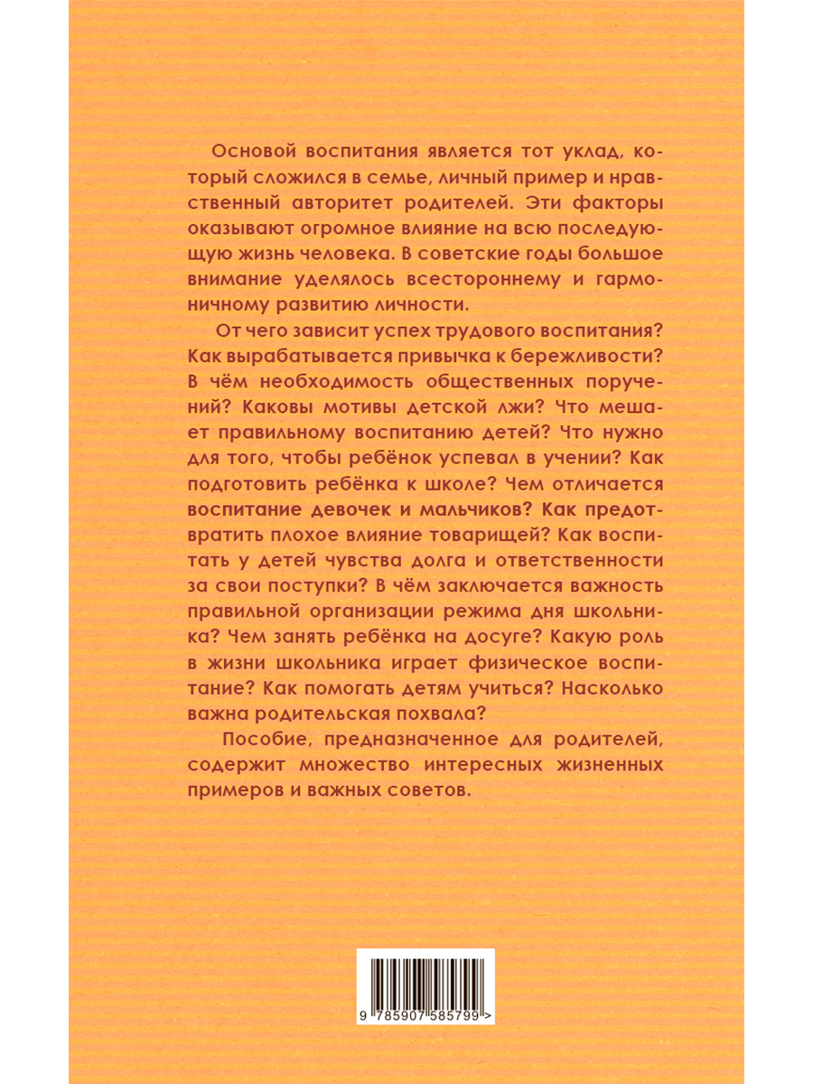 От чего зависит успех трудового воспитания? Как вырабатывается привычка к бережливости? В чём необходимость общественных поручений? Каковы мотивы детской лжи? Что мешает правильному воспитанию детей? Что нужно для того, чтобы ребёнок успевал в учении? Как подготовить ребёнка к школе? Чем отличается воспитание девочек и мальчиков? Как предотвратить плохое влияние товарищей? Как воспитать у детей чувства долга и ответственности за свои поступки? В чём заключается важность правильной организации режима дня школьника? Чем занять ребёнка на досуге? Какую роль в жизни школьника играет физическое воспитание? Как помогать детям учиться? Насколько важна родительская похвала?