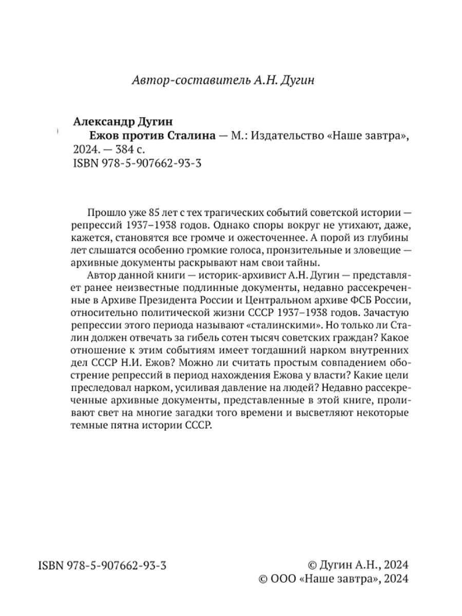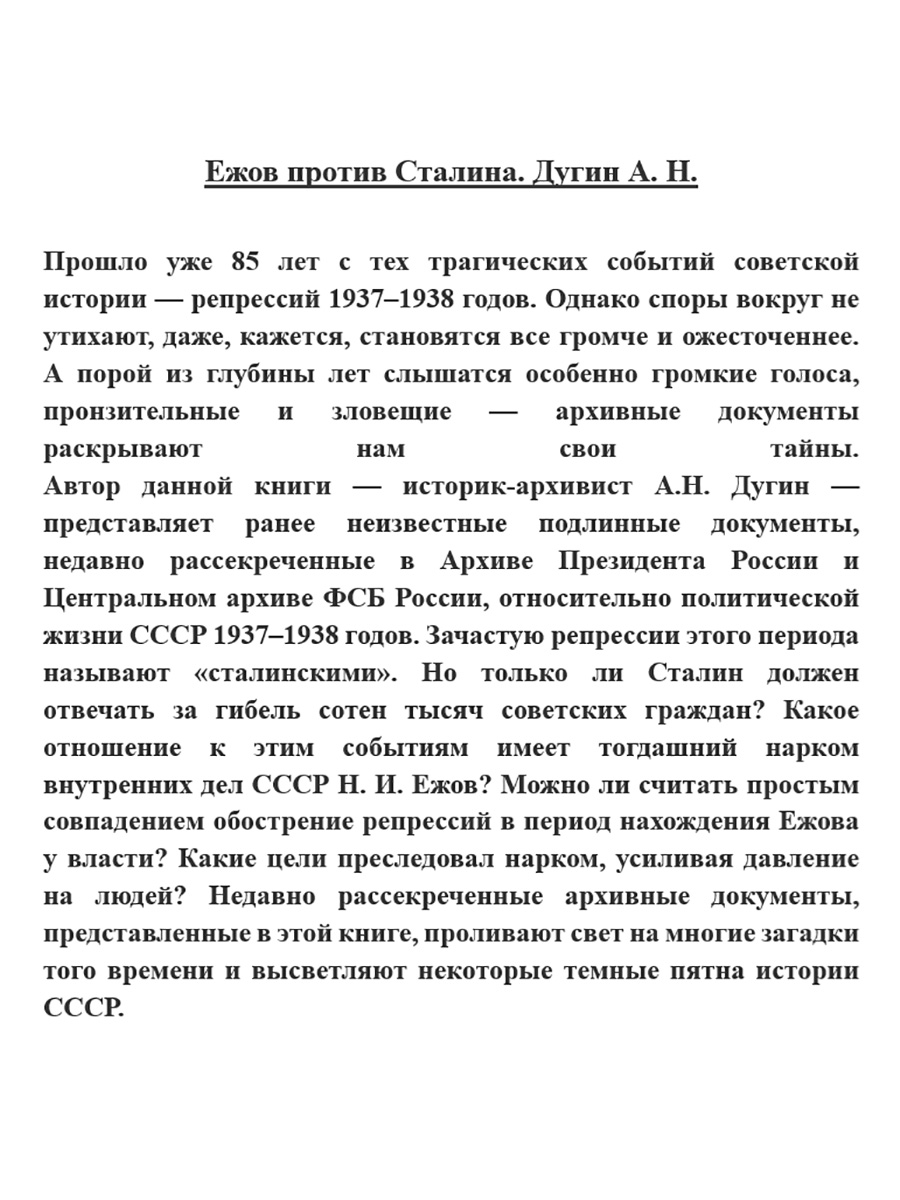 Автор данной книги — историк-архивист А.Н. Дугин — представляет ранее неизвестные подлинные документы, недавно рассекреченные в Архиве Президента России и Центральном архиве ФСБ России, относительно политической жизни СССР 1937–1938 годов. Зачастую репрессии этого периода называют "сталинскими". Но только ли Сталин должен отвечать за гибель сотен тысяч советских граждан? Какое отношение к этим событиям имеет тогдашний нарком внутренних дел СССР Н. И. Ежов? Можно ли считать простым совпадением обострение репрессий в период нахождения Ежова у власти? Какие цели преследовал нарком, усиливая давление на людей? Недавно рассекреченные архивные документы, представленные в этой книге, проливают свет на многие загадки того времени и высветляют некоторые темные пятна истории СССР.